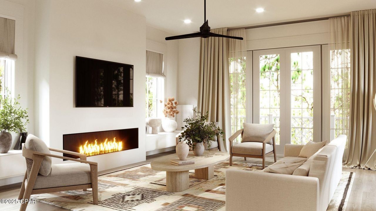 Nestled within the thoughtfully developed community of Grande Pointe, this exquisite three-story residence by 30A Builders seamlessly blends coastal design with contemporary elegance. Offering over 2,900 square feet of heated living space, the home is thoughtfully designed across three spacious levels, delivering a harmonious balance of style and function. Inside, rich hardwood flooring flows throughout, complementing the 10-foot ceilings and tongue-and-groove wood accents that add warmth and character to the home. With the convenience of an elevator designed to service all floors. The heart of the home is a beautifully appointed kitchen featuring custom cabinetry, a 48'' range, dishwasher, and large pantry. The open-concept layout continues into the expansive great room and dining area, ideal for gathering and entertaining. The living room features a sleek horizontal fireplace and French doors that open to the first-floor balcony, creating a seamless connection between indoor comfort and outdoor relaxation. The third-floor primary suite serves as a private retreat, complete with a large walk-in closet, dual vanities, and balcony access. Two additional bedrooms and tastefully designed bathrooms ensure comfort and privacy for family and guests alike. Step outside to discover your private backyard oasis, featuring lush landscaping and a generously sized pool perfect for cooling off or lounging under the sun. Exterior highlights include board and batten siding with mitered corners, standing seam metal roofing, and charming wood arbors. Enjoy multiple outdoor living areas, including covered porches and balconies on every level. From its curated interior finishes to its idyllic setting in Grande Pointe, this home is a rare blend of craftsmanship, comfort, and coastal sophistication. Estimated completion date Dec 2025-Jan 2026